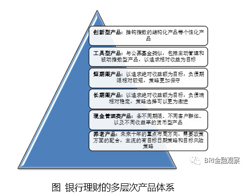 有鉴于此,银行理财子公司在业务发展中,应清晰定位,坚持资产管理和负债管理并重。产品布局上应发展多层次产品体系,明确各类型产品投资目标和定位,具体的产品体系可如如下图: