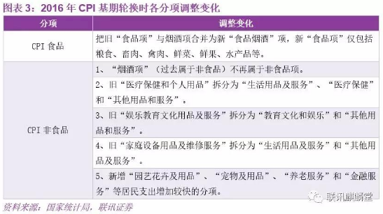 最近的一次基期轮换在2016年,以2015年作为新一轮的对比基期,新的基期使用年份为2016年到2020年。这一次基期轮换,各个分项的调整变化如表所示。