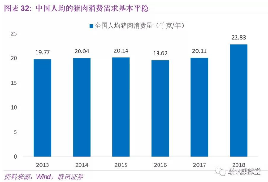 和大多数商品价格变动同时受供、需两端变化的影响不同,猪肉消费的需求比较稳定。根据国家统计局数据,2013-2017年中国人均猪肉年消费在20kg左右,2018年有所增加,但总的来说猪肉需求基本平稳。