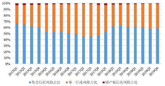 图3 2015Q1-2019Q4信托资产按功能分类的规模及其占比(亿元)