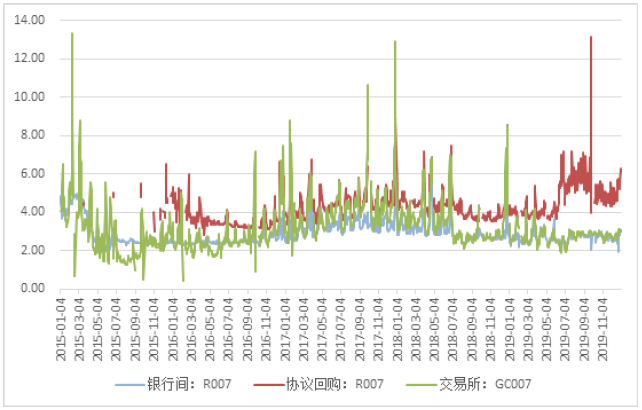 上图中分别代表了银行间加权7天回购利率,交易所协议回购加权7天回购利率和交易所场内加权7天回购利率。隔夜利率在2016年之后波动幅度较大,7天相对平稳能更好过滤波动性;与更长期限的14天或28天的资金相比,成交规模又相对更高,更具代表性。所以,R007是一个相对折中的选择。
