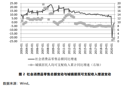 在2008年全球金融危机爆发后至今,中国社会消费品零售总额同比增速整体上呈现趋势性下降趋势。造成该趋势的主要原因有二,一是同期内城乡居民可支配收入增速是整体下行的(图2),二是同期内居民部门杠杆率显著上升,而杠杆率的上升将会挤出居民消费(图3)。后者的主要逻辑是,全球金融危机之后中国居民杠杆率上升的主要原因是购买房地产。如果一个家庭不得不将更高比例的收入用于偿还房贷的话,那么该家庭能够用于其他消费的收入比例自然就会相应下降。
