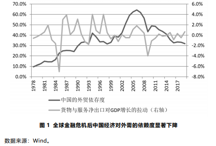 “双循环”新发展格局提出的宏观背景之二,是随着中国经济总量的崛起,中国经济的对外依存度必然会降低,未来的经济增长潜力将在更大程度上取决于内需的挖掘程度。如图1所示,一方面,中国经济的外贸依存度(进出口总额占GDP的比率)已经由2006年62.4%的历史性峰值下降至2019年的31.8%;另一方面,货物与服务贸易净出口对中国GDP增长的拉动也由1994年至2007年期间的年均0.8个百分点下降至2008年至2019年期间的年均-0.4个百分点。虽然中国经济的外贸依存度已经下降了将近一半,但依然显著高于美国等发达经济体的水平。这意味着,随着中国经济体量的上升,中国经济增长必然越来越依赖国内需求的支撑,这也是世界经济发展的普遍规律。