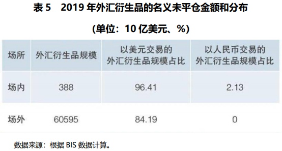 从外汇和利率这两种最主要的金融衍生品来看(见表5、表6),场外规模均远大于场内规模,而以美元交易的衍生品均占据主导地位。人民币场外外汇和利率衍生品的规模非常小,人民币场内外汇和利率衍生品的规模也无法与美元衍生品抗衡。