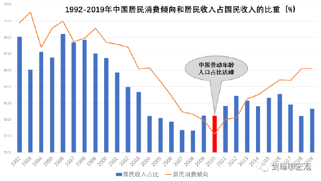 那么,在居民收入占比过低和消费倾向过低两个因素中,哪一个对消费的影响更大呢?是前者。因为消费倾向依赖于收入,收入高,收入稳定,消费倾向自然也就高。而且,观察新冠疫情前的数据可以发现,自2010年中国劳动年龄人口占比达峰以后,居民消费倾向就在不断上升,相应的,居民储蓄倾向(储蓄/可支配收入)不断下降。