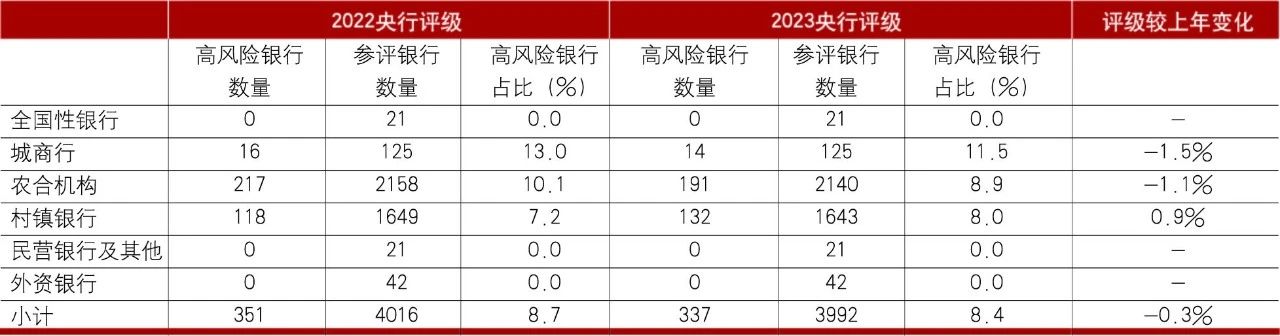 从国家金融监督管理总局公布的数据看,目前中小银行(城商行、农商行、村镇银行及民营银行等几类主体)的资本充足率状况仍面临较大压力。截至2023年末,中国商业银行整体资本充足率为15.06%,其中,大型商业银行、股份制银行、城商行、农商行和民营银行的资本充足率分别为17.56%、13.43%、12.63%、12.22%和12.32%。总体来看,各类中小银行的资本充足率要显著低于中大型银行,且较上年均有不同程度下降,其中,农商行下降15个基点,民营银行下降8个基点,风险抵补能力有待提升。从风险状况来看,根据中国人民银行《金融稳定报告》披露的数据,2023年二季度末,银行业共有高风险机构337家,全部集中在中小机构,其中农合机构(农村商业银行、农村合作银行、农村信用社)191家,村镇银行132家,城商行14家(见表2)。