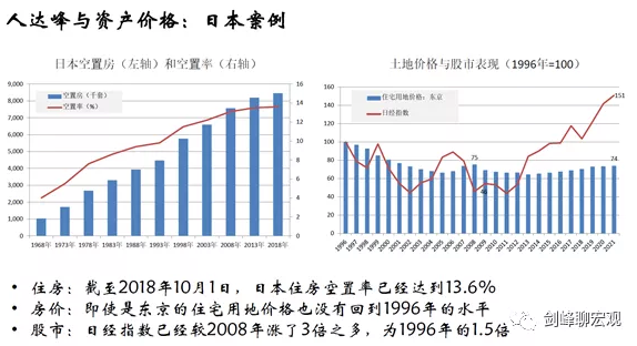 日本在人达峰之后还有一个特点,1990年日本泡沫经济危机,股价、房价大幅度下跌,一直差不多跌到1995年、1996年是谷底。以1996年为基准年,1996年为基准年等于100的话,2008年东京住宅用地价格是75,同时日经指数是46。从2008年开始算起,如果2008年那个时候在东京买了房,到今年是多少呢?是74。也就是说,你2008年买了房,现在房价还是跌的,如果你在2008年买了股票,那时候是46,现在是差不多翻了3倍。即使跟1996年相比,如果你买了股票的话,差不多也是翻了1.5倍。